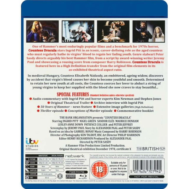 One of Hammer's most enduringly popular films and a benchmark for 1970s horror, Countess Dracula stars Ingrid Pitt in an iconic, career-defining role as the aged countess who must regularly bathe in virgins' blood to regain her fading youth. Genre stalwart Peter Sasdy directs arguably his best Hammer film, from a script by award-winning writer Jeremy Paul and showcasing a rousing score from composer Harry Robinson. Countess Dracula is featured here in a High Definition transfer from the original film elements in its as-exhibited theatrical aspect ratio.